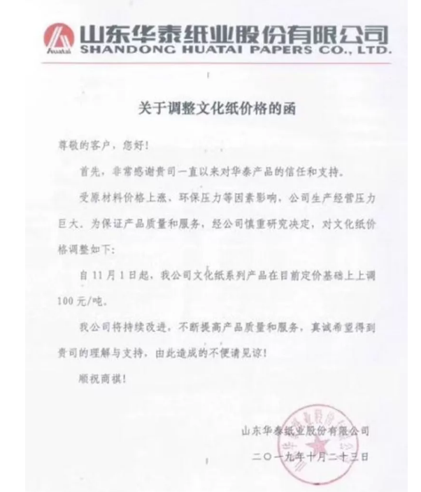 如华泰股份23日就向市场发出一份涨价函,表示将在11月1日起,对公司旗下文化纸产品上调100元/吨。