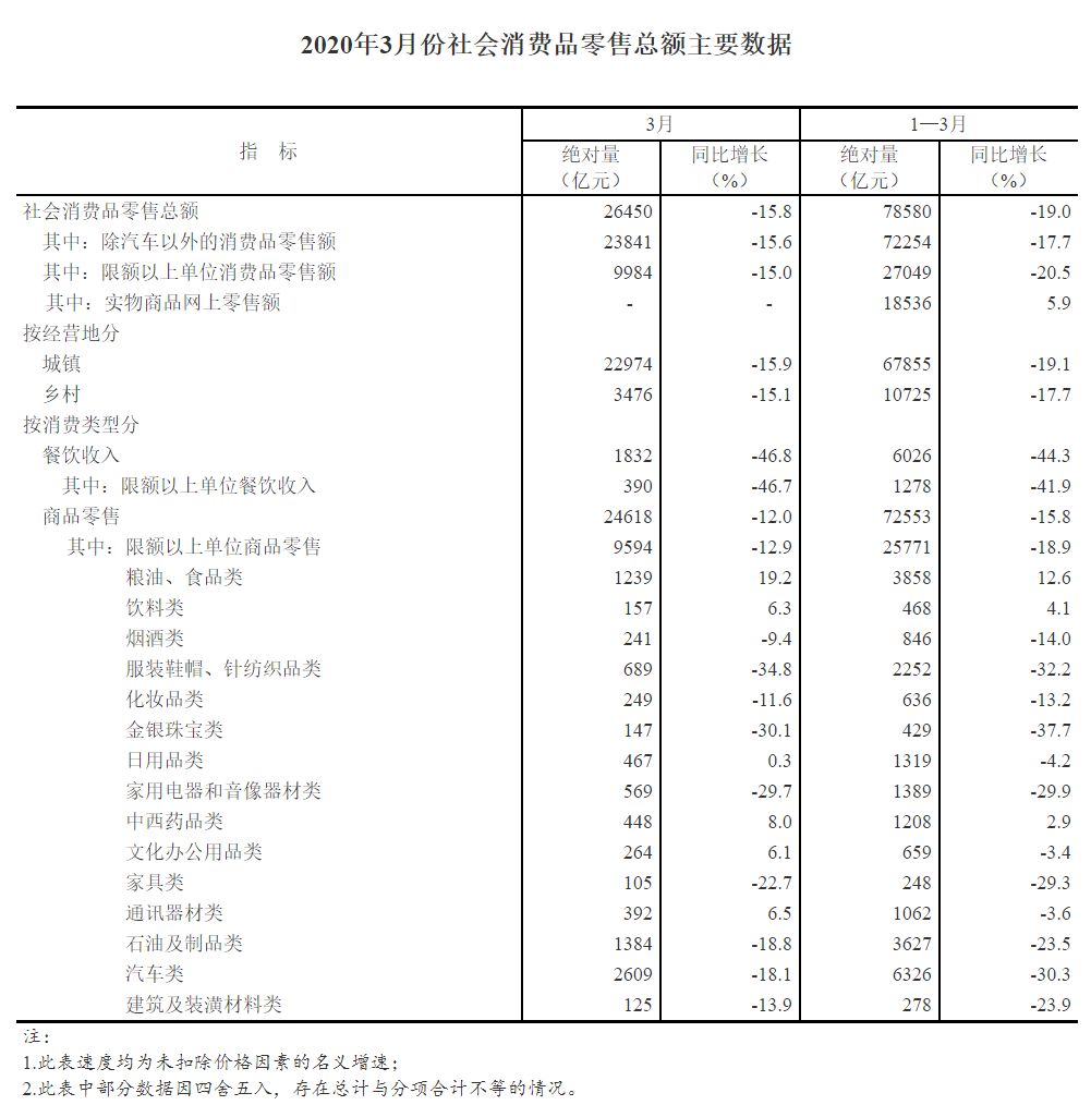 3月份,社会消费品零售总额26450亿元,同比下降15.8%(扣除价格因素实际下降18.1%,以下除特殊说明外均为名义增长),降幅比1—2月份收窄4.7个百分点。其中,除汽车以外的消费品零售额23841亿元,下降15.6%。