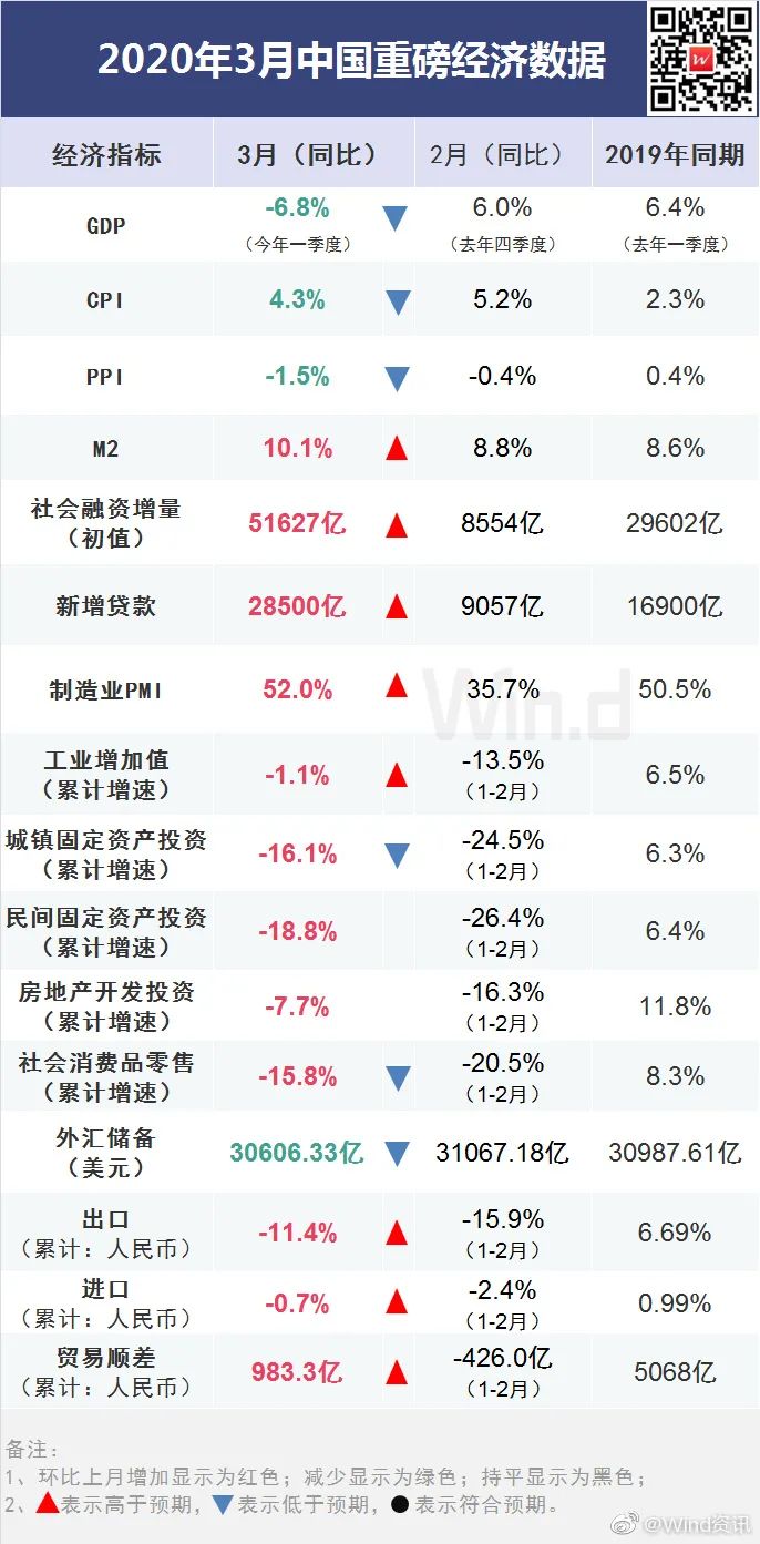 3、中国3月社会消费品零售总额同比下降15.8%,预期下降10%,1-2月下降20.5%。