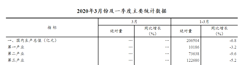 初步核算,一季度国内生产总值206504亿元,按可比价格计算,同比下降6.8%。分产业看,第一产业增加值10186亿元,下降3.2%;第二产业增加值73638亿元,下降9.6%;第三产业增加值122680亿元,下降5.2%。
