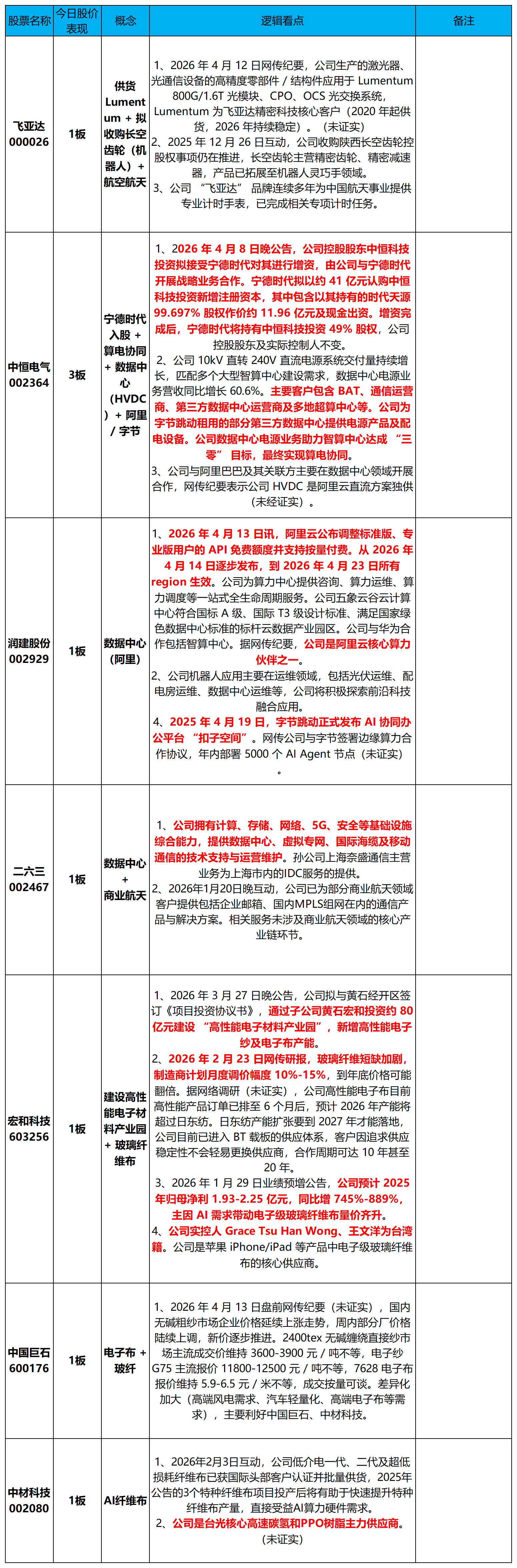 上周提到的人工智能领域的玻纤布,今天宏和科技也开始创新高了,中材科技、中国巨石都有涨停。这就是跟大家讲的,不要看到涨停再后悔的拍大腿,要提前研究,才能提前把握行情。