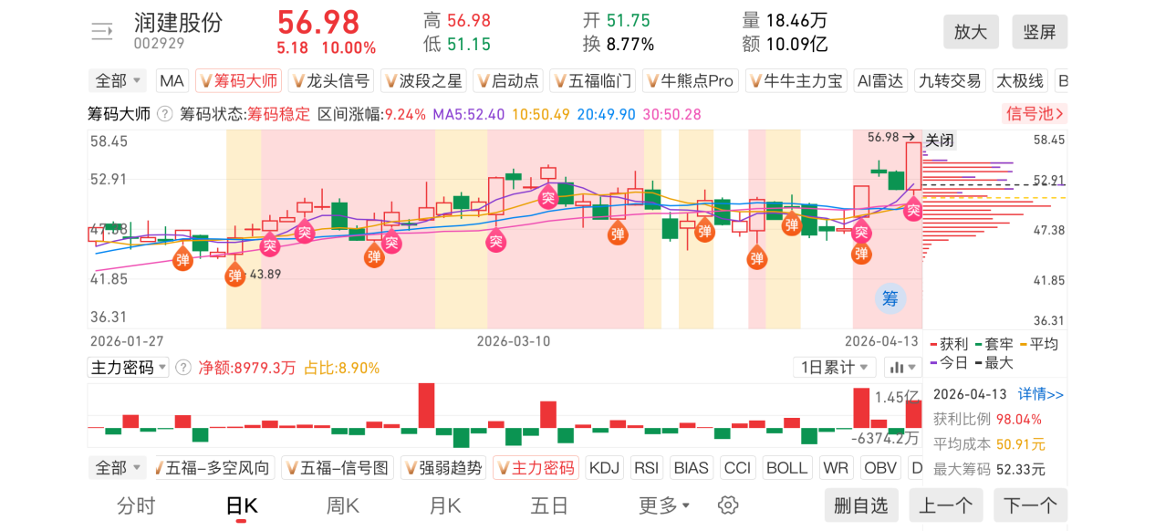 1)20260413-润建股份-002929-【筹码大师】和【牛牛机构宝】-近期出现弹信号且底部量柱由绿转红