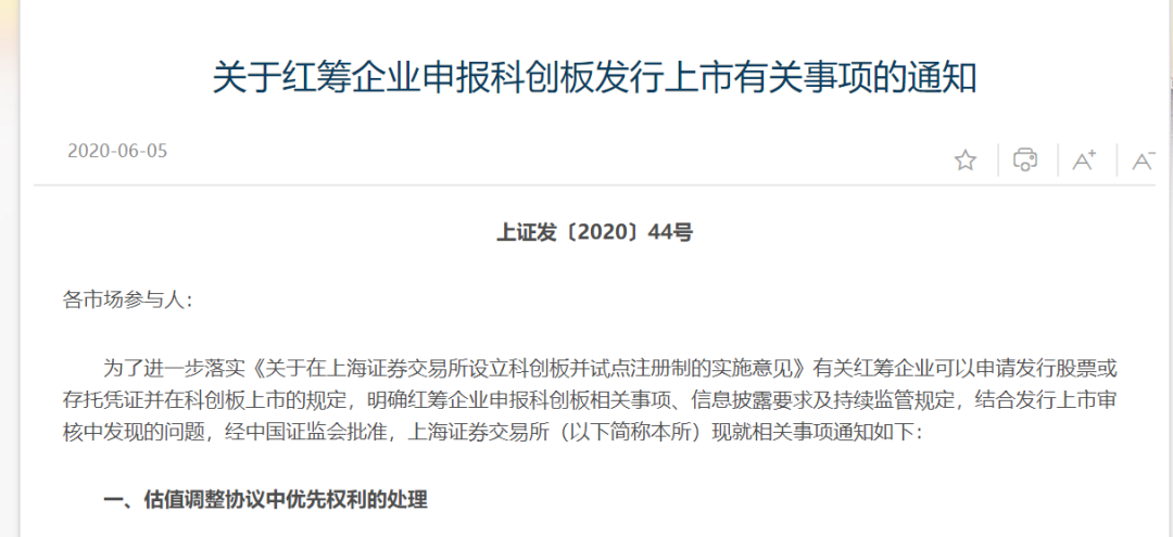6月5日,经中国证监会批准,上交所发布《关于红筹企业申报科创板发行上市有关事项的通知》(下称《通知》),对红筹企业申报科创板发行上市中,涉及的对赌协议处理、股本总额计算、营业收入快速增长认定、退市指标适用等事项,做出了针对性安排。