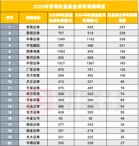 从中基协披露的代销百强榜券商数据来看,2025年权益基金保有规模增量竞争异常激烈。招商证券以247亿元的增量高居榜首,其保有规模从2024年的658亿元增至904亿元。国信证券以238亿元增量紧随其后,华泰证券以208亿元增量位列第三。这三家券商均获得1分加分。
