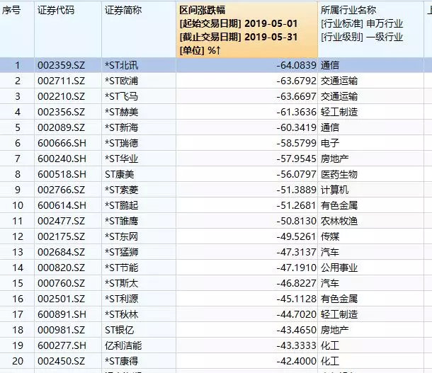 5月份ST股狂掀跌停潮,成为暴跌重灾区,跌幅前20的股票有19只为ST股。5只ST股跌幅更是超过60%,分别为*ST北讯、*ST欧浦、*ST飞马、*ST赫美、*ST新海。