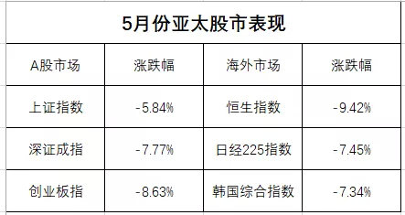 A股并不孤单。5月份港股跌幅更大,恒生指数今日跌破27000点,下跌0.79%,收报26901.09点,5月以来下挫9.42%;亚太市场日经225指数、韩国综合指数等也大幅下挫,分别下跌7.45%、7.34%。美股道琼斯指数5月来也大跌5.35%。