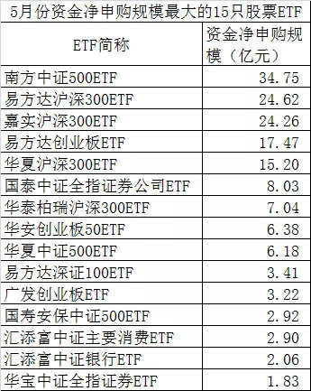 虽然外资持续净流出,但有着大资金A股市场风向标意义的ETF(交易型开放式指数基金),5月份合计净申购资金量有约为140亿。