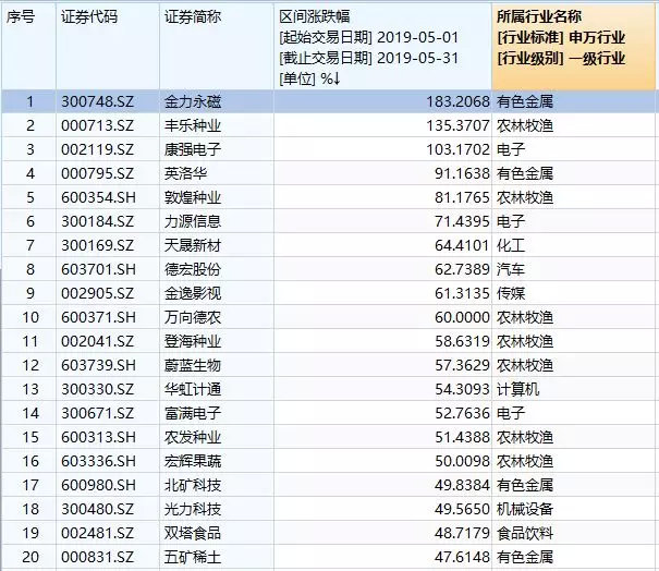 5月份,跌幅最大的*ST北讯,股价暴跌64.08%;另外还有4只ST股跌幅超60%;同时也有3只题材股股价翻倍,稀土龙头金力永磁暴涨183%,丰乐种业、康强电子股价涨幅也超100%。