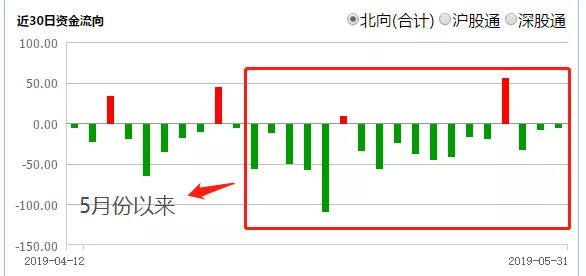 市场人士分析,北上资金5月以来持续净流出,可能与贸易战以及海外市场动荡有关。