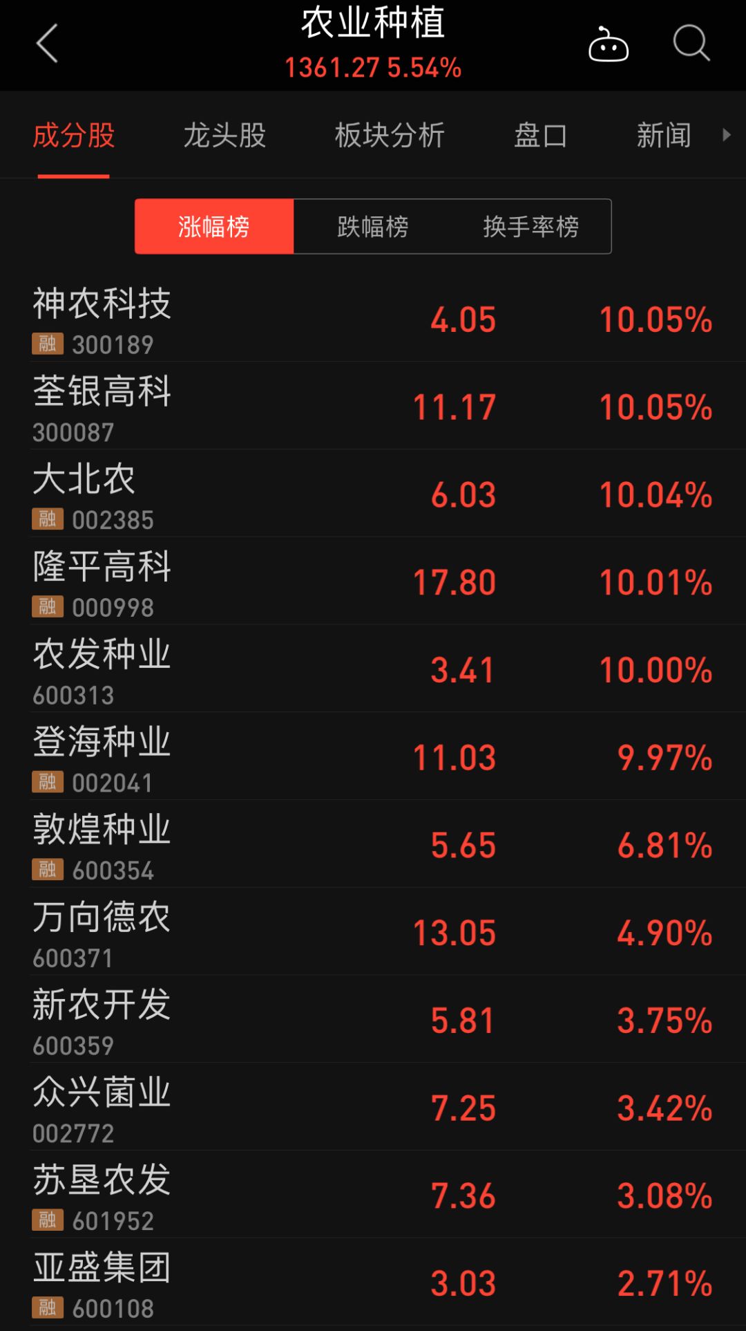 农业股开盘即走强,大北农、隆平高科一字板,农发种业、登海种业、神农科技高开秒板,丰乐种业等跟涨。