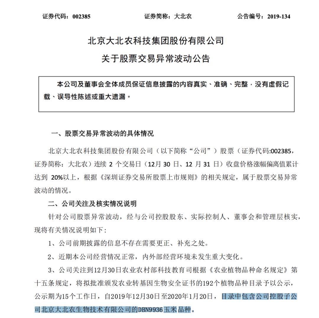 直接受益的大北农已经创出四连板。2019年12月31日,公司发布公告称:“关注到拟批准颁发农业转基因生物安全证书目录中包含公司控股子公司北京大北农生物技术有限公司的DBN9936玉米品种。”
