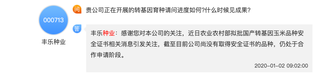 互动易上也涌现出一批有关上市公司育种情况和成效的问题。其中,丰乐种业回复称:“近日农业农村部拟批国产转基因玉米品种安全证书相关消息引发关注,截至目前公司尚没有取得安全证书的品种,仍处于合作申请阶段。”
