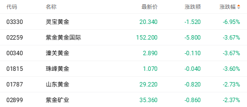 截至收盘,灵宝黄金(03330.HK)跌6.95%,紫金黄金国际(02259.HK)跌3.67%,山东黄金(01787.HK)跌2.73%。