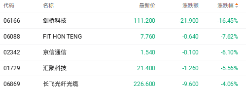 截至收盘,剑桥科技(06166.HK)跌16.45%,京信通信(02342.HK)跌6.10%,汇聚科技(01729.HK)跌5.56%。