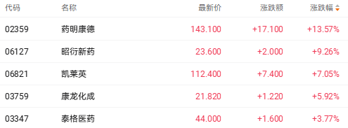 截至收盘,药明康德(02359.HK)涨13.57%,昭衍新药(06127.HK)涨9.26%,凯莱英(06821.HK)涨7.05%。