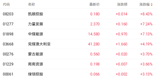 截至收盘,力量发展(01277.HK)涨7.24%,中煤能源(1898.HK)涨7.13%,兖煤澳大利亚(03668.HK)涨4.19%。