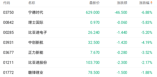 截至收盘,宁德时代(03750.HK)跌6.88%,理士国际(00842.HK)跌5.83%,比亚迪电子(00285.HK)跌5.20%。