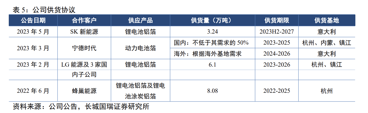 2019年至2022年,公司铝箔产销量、市场占有率均位居国内第一。公司电池箔客户涵盖了国内主要的储能和动力电池生产厂商,包括宁德时代、比亚迪、ATL集团、LG新能源、国轩高科、蜂巢能源等,已与众多优质客户建立了长期稳定的合作关系。