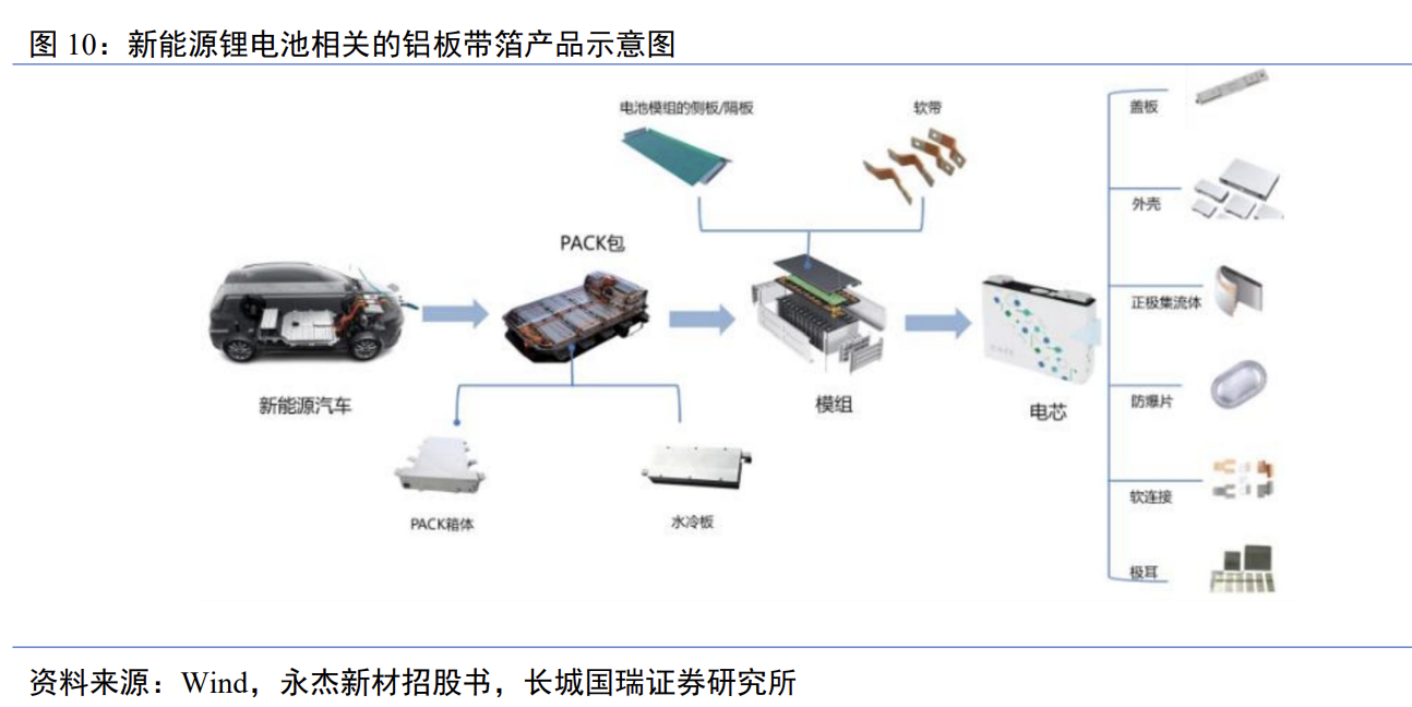 电池铝箔即为锂电池集流体铝箔,新能源电池用铝产品包括电池铝箔、铝塑膜、电池pack包用铝及电池水冷板等。电池铝箔指的是作为锂离子充电电池正极集电体的铝箔,可以大幅度降低正极材料和集流体间的接触电阻,提高两者之间的附着能力,从而显著提升纯电动汽车及混合动力汽车续航能力。其他合金铝板带产品主要应用于动力锂电池的结构件(含电芯外壳、盖板、防爆片、软连接、极耳、PACK箱体等)。