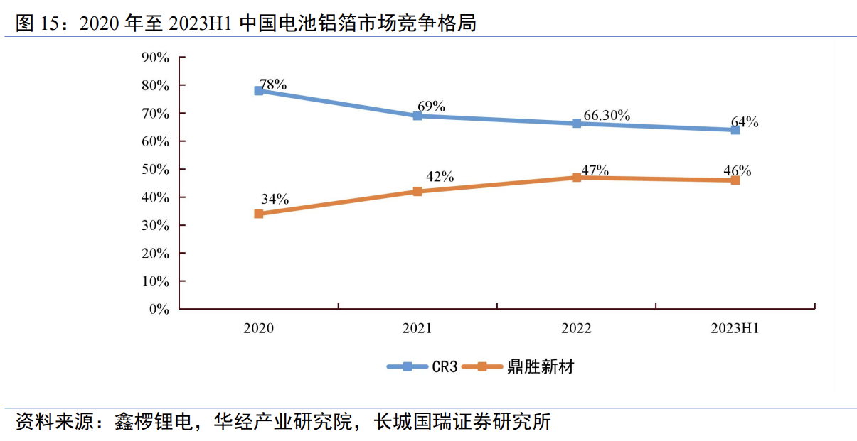 头部企业集中度提升,产能逐步释放后加工费下行。行业竞争格局较为集中,鼎胜新材市占率连续领先。电池铝箔行业CR3从2020年的78%逐年下降至2023年上半年的64%,竞争格局相对集中。主要系2021年全球新能源汽车市场火热,带动动力电池铝箔需求量攀升,加工费上调吸引更多的企业涌入电池箔赛道。2021年在电池箔加工费大幅上涨的背景下,鼎胜新材及时调整产品结构,将低附加值产线陆续转产生产动力电池箔,使得公司凭借先发优势巩固并扩大了电池箔领域市场份额,市占率从2020年的34%增长至2023年H1市占率的46%。随着多家企业新增和技改产能的逐步释放,业内各家厂商将迎来产能、产品良率、国内外客户结构等综合实力的比拼,2024年的电池铝箔市场仍旧可期。