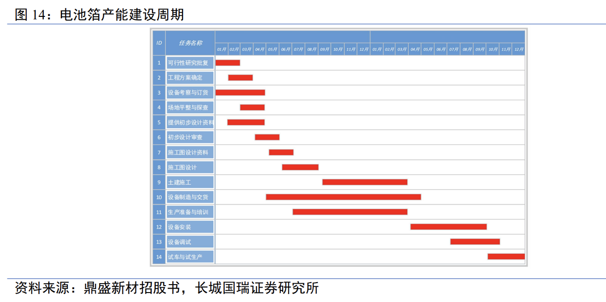 电池铝箔扩产主要通过新建产能及现有铝箔产线转产实现:从新建产能来看,受限于设备采购安装、客户认证周期长,完全达产周期需2年以上。业内企业多引进德国阿亨巴赫公司的箔轧机、分切机,设备厂商产能有限,由公司招股书中募投项目规划进度显示,设备制造与交付周期约1年,安装调试需半年,产能施工建设流程部分可同时进行。此外,只有供应商通过资质认定,双方才会形成长期的合作关系,汽车零部件原材料供应商必须进行资格认证,审定过程中将对供应商的产品品质、生产流程、质量管理甚至经营状况等多方面提出严格的要求,一般审定时间多达半年及以上。因此,设备交付、产能建设及下游认证时长将影响供给释放进程,整体达产周期超过2年。从转产来看,其他厂商受制于转产后良率较差及较高机会成本,转产动力不足。电池铝箔与双零箔在厚度范围和技术上接近,因此电池箔通常由双零箔产线进行转产。鼎胜新材使用国产设备,多年持续钻研设备及工艺技术,不仅避免了进口设备卡脖子风险,更能实现快速转产。从良品率来看,鼎胜新材电池箔产品优于同行,同行需投入大量成本和时间来进行提升,对应经济性较差。此外,考虑到双零箔产线转产意味着放弃原有产线带来的收益,不具备设备和技术支撑的厂商转产动力不足。