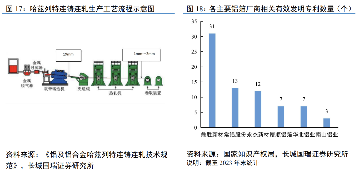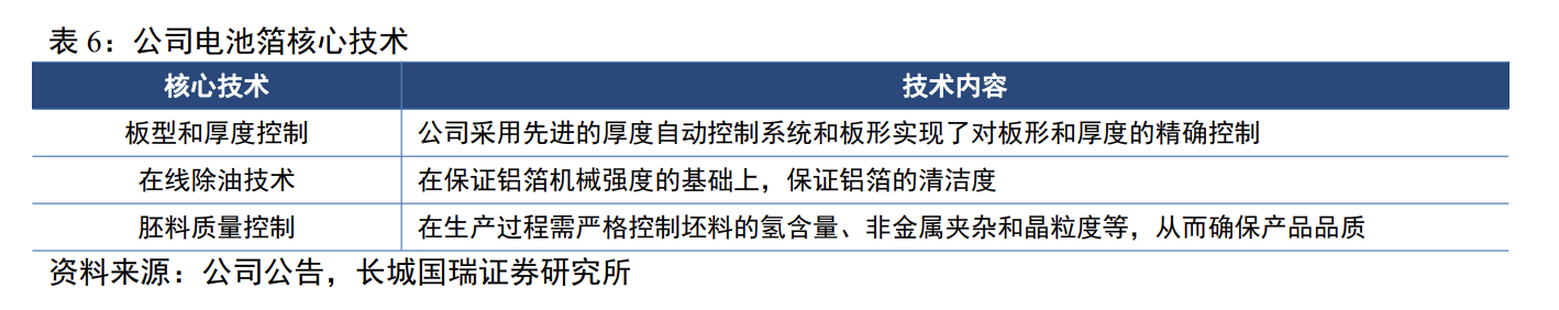 具备独特铝箔加工工艺,可快速实现电池箔转产。公司具备较强的合金研发能力,在多种产品中创新性运用新的合金成分与配比,满足客户的不同需求。铝箔生产工艺流程复杂,对合金成分配比、轧制速度、退火等参数等均有严格要求,最终影响产品的组织均匀性、延展性、强度、深冲性能、平直性等各项性能。公司自主研发的电池箔,采用公司特有的合金配制工艺,通过合理调整铁硅比,控制铜钛等其他微量元素的手法,促进产品内部有利于性能指标的第二相化合物的产生和固熔体的析出,从而有效控制产品的机械性能。而新进厂商需较长时间累积生产技术,以提高产品成品率及改善性能。公司具备生产工艺优势,电池箔相关专利数量行业领先。近年来公司自主研发的新一代动力锂电池用铝箔/薄板系列产品,用的是“铸轧—冷轧短流程绿色制造技术”,该技术从成分优化、熔炼工艺、连续铸轧工艺和冷轧/箔轧过程工艺的优化以及性能检测、质量精控技术进行全产业链创新,使用了铸轧法代替热轧法生产动力电池用铝箔/薄板,降低了动力电池用铝箔/薄板生产企业的生产成本,提高了市场竞争力,在很大程度上推动了国内电池铝加工行业的发展。截至2023年6月30日,公司共获得专利172项,其中发明专利87项,经查询国家知识产权局显示,公司已获取电池铝箔相关有效发明专利31项,专利数量行业领先。
