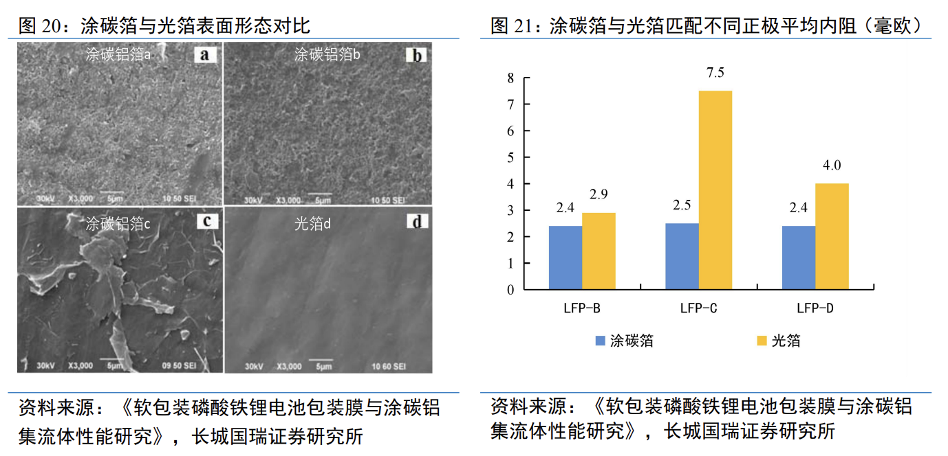 延伸涂碳环节工艺,新品增加铝箔盈利空间。涂碳铝箔作为改性正极集流体,可降低集流体之间接触电阻,收集活性物质的微电流进而改善电池的倍率充放电性能、循环性能。涂碳铝箔是通过在光箔表面涂覆一层均匀的导电性材料(如炭黑、石墨片和石墨烯)而制得,对比涂炭铝箔与光箔,涂碳铝箔表面形态更加均匀。涂碳铝箔表面涂覆层作为桥梁可提升正极片的导电性、降低电池内阻;此外,可提高活性物质与集流体的粘附力,目前主要用于磷酸铁锂电池。