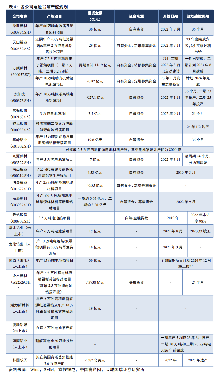常铝股份:年产3万吨电池箔项目于2022年9月开工,预计24年实现完全投产;国外的主要电池铝箔供货商是日本UACJ和韩国乐天铝业。