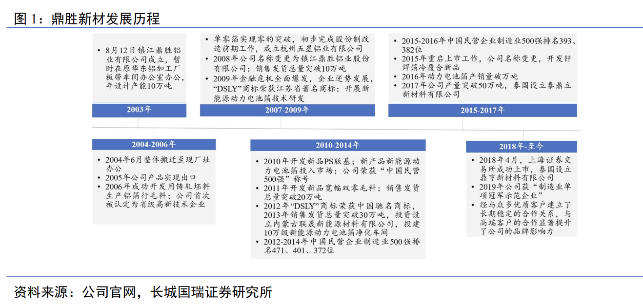鼎胜新材是国内铝箔行业的龙头企业,其历史可追溯至2003年。公司主营业务为铝板带箔的研发、生产与销售,产品线涵盖空调箔、新能源电池箔、单零箔、双零箔等多个品类,广泛应用于绿色包装、家用电器、锂电池及交通运输等领域。公司在电池铝箔领域布局较早,2009年启动相关业务,产品于次年投放市场,至2016年产量已突破万吨。根据公开信息,2022年上半年该公司在国内市场的占有率已达到约49%,稳居行业第一。经过近二十年的深耕,公司已成为全球锂电铝箔产销量领先的制造商,自2015年起产销量及市场占有率持续位居行业首位,并与宁德时代、LG新能源、比亚迪等国内外主流电池厂商建立了稳定的合作关系。