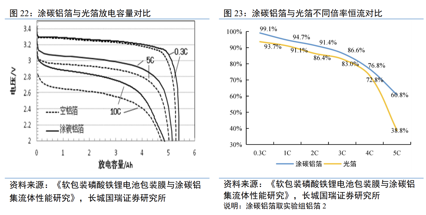 搭载涂碳铝箔的电池具有更佳的充放电倍率性能,适合电池大倍率快充技术。涂碳铝箔表面均匀的导电涂层可增加活性物质与集流体之间的接触面积,从而在大电流快速充放电时更快的传递电子、收集电流。倍率放电主要研究电池的放电速率及电压平台,C表示放电快慢的一种量度,所用的容量1小时放电完毕,称为1C放电;5小时放电完毕,则称为1/5=0.2C放电。在较低倍率放电时,两种铝箔的放电曲线几乎重合,但5C时,空箔较涂碳铝箔电压平台开始降低,当倍率达到10C时,空箔放电电压明显低于涂碳铝箔。相同容量的电池,电压平台越高,则电池的有效使用时间越长;倍率充电主要研究电池不同充电倍率下电池的恒流比,5C充电时,涂碳铝箔恒流时间明显比空铝箔时间长,更适用于大倍率充电用途。