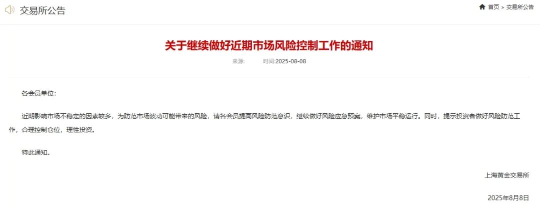 上海黄金交易所8日发布关于继续做好近期市场风险控制工作的通知。通知称,近期影响市场不稳定的因素较多,为防范市场波动可能带来的风险,请各会员提高风险防范意识,继续做好风险应急预案,维护市场平稳运行。同时,提示投资者做好风险防范工作,合理控制仓位,理性投资。