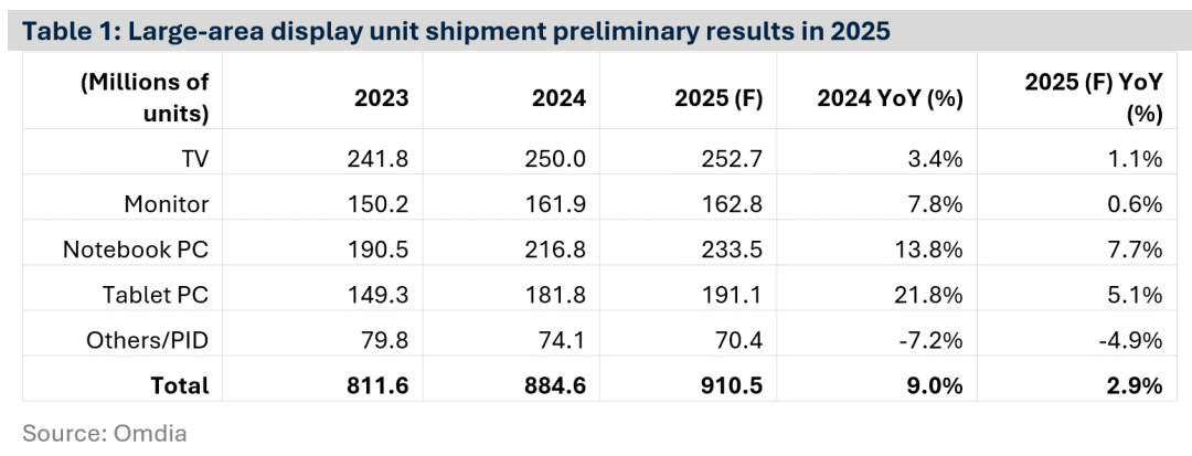 Omdia:2025年大尺寸显示面板出货量同比增长2.9%