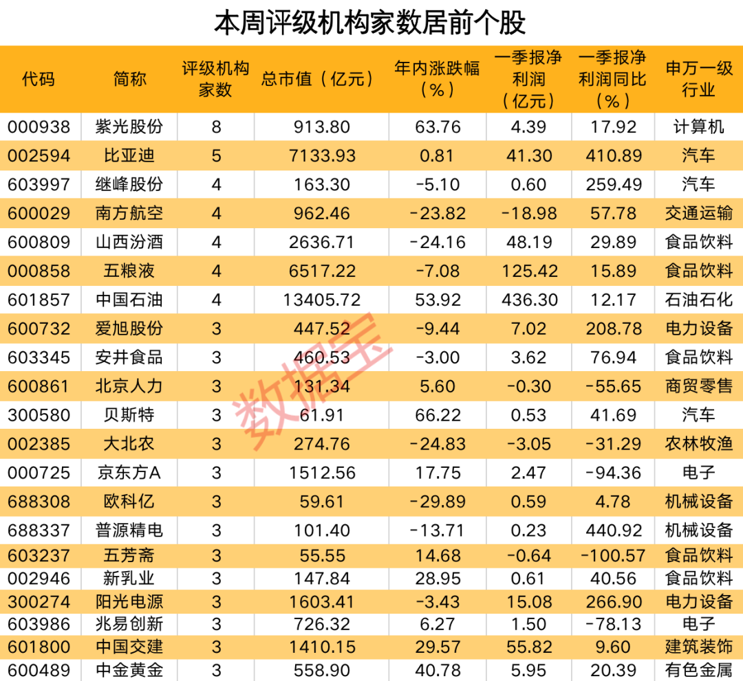 数据宝统计,个股方面,21股获3家及以上机构“买入”评级。其中,ICT(信息与通信技术)龙头紫光股份最受关注,有8家机构评级。