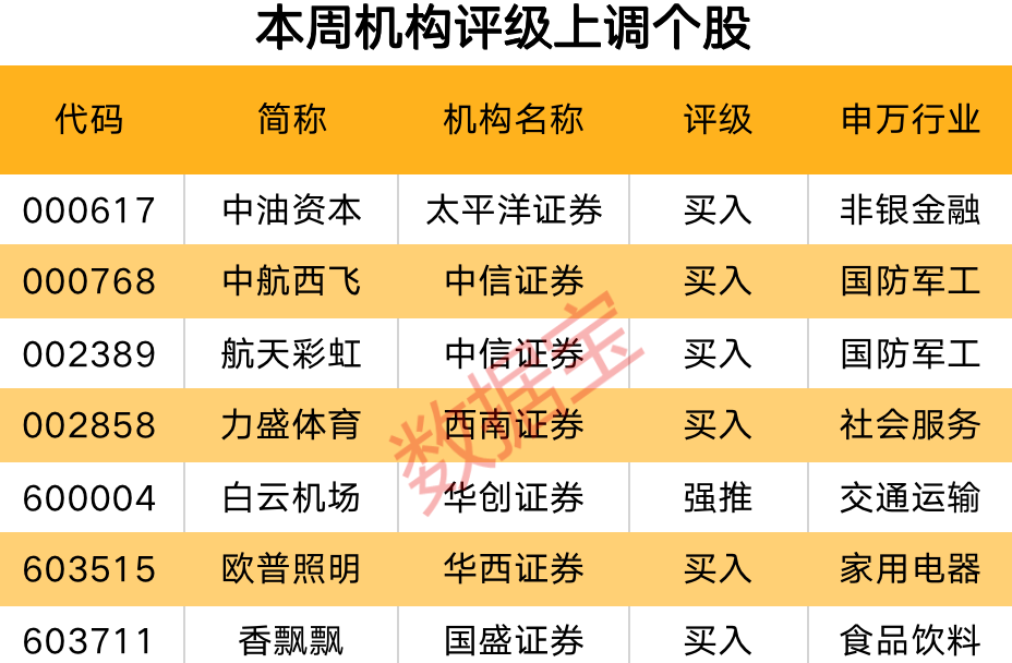 本周,机构上调7股评级。其中国防军工股航天彩虹和中航西飞获中信证券上调至“买入”评级。另外,太平洋证券上调中油资本至“买入”评级,华创证券上调白云机场评级至“强推”。