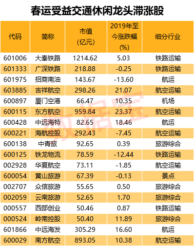 在板块带动下,一些合理估值滞涨股有望受益。证券时报·数据宝统计显示,运输及休闲娱乐板块,自2019年初至今跑输大盘涨幅23.71%,且最新市值高于50亿的个股共有15只。