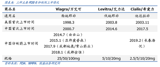 国盛证券研报指出,PDE-5 抑制剂类药品为抗ED主力产品。自1998年首个PDE-5抑制剂西地那非用于临床治疗ED 以来,ED的治疗进入了一个新阶段。1998年3月美国FDA正式批准辉瑞的西地那非(Viagra,万艾可)上市,2003年8月和11月FDA又相继批准了拜耳的伐地那非(Levitra,艾力达)和礼来的他达拉非(Cialis,希爱力)上市,是目前全球市场最主要的三种PDE-5 抑制剂。