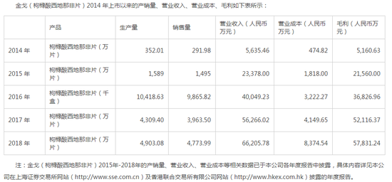 据媒体报道,2014年,白云山推出首个国产“伟哥”——金戈。当年,其金戈销售291.98万片, 营收5635.46万元;2015年,销售1495万片,营收2.34亿元。2018年,金戈销售4773.99万片,营收高达6.62亿元,毛利为5.78亿元。