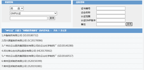中证君在国家药品监督管理局网站搜索“枸橼酸西地那非”,目前齐鲁制药有限公司、四川源基制药有限公司、白云山、常山药业、常州亚邦制药有限公司等公司拥有GMP认证。