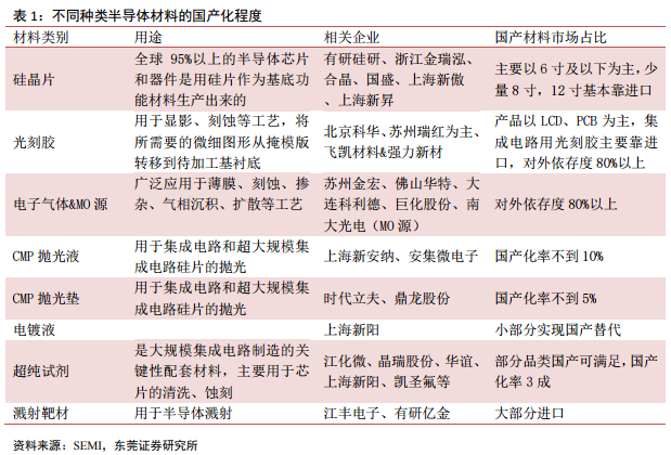 半导体材料:技术壁垒高,高端依赖进口。在半导体材料领域,由于高端 产品技术壁垒高,国内企业长期研发投入和积累不足,我国半导体材料在 国际分工中多处于中低端领域,高端产品市场主要被欧美日韩台等少数国 际大公司垄断,比如:硅片全球市场前六大公司的市场份额达90%以上, 光刻胶全球市场前五大公司的市场份额达80%以上,高纯试剂全球市场前 六大公司的市场份额达80%以上,CMP材料全球市场前七大公司市场份额 达90%。国内大部分产品自给率较低,基本不足30%,并且大部分是技术 壁垒较低的封装材料,在晶圆制造材料方面国产化比例更低,主要依赖于 进口。另外,国内半导体材料企业集中于6英寸以下生产线,目前有少数 厂商开始打入国内8英寸、12英寸生产线。