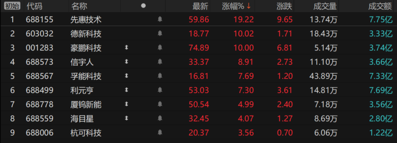 受上述消息影响,今日固态电池板块走高。截至发稿,德新科技、豪鹏科技涨停,先惠技术涨超18%,信宇人涨超8%,利元亨、孚能科技涨超7%,海目星、厦钨新能等跟涨。