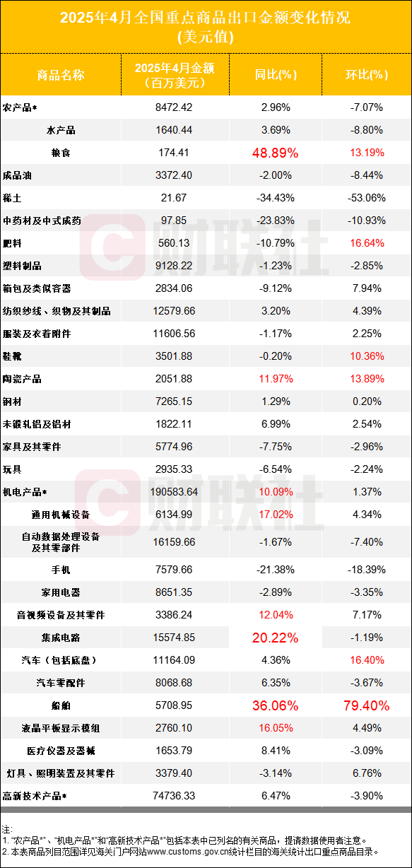 财联社整理今年4月重点商品出口金额变化情况发现: