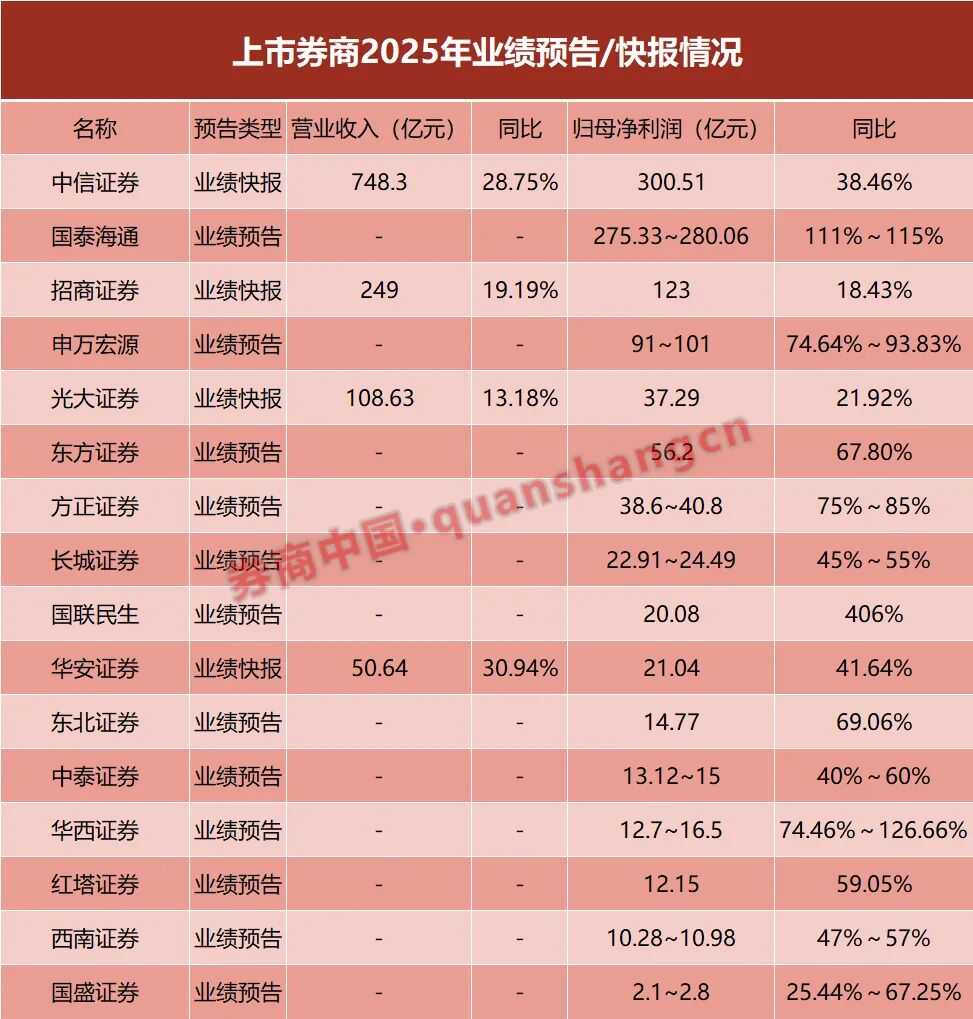 截至1月29日晚,共有16家上市券商预告了2025年业绩情况,悉数预喜。