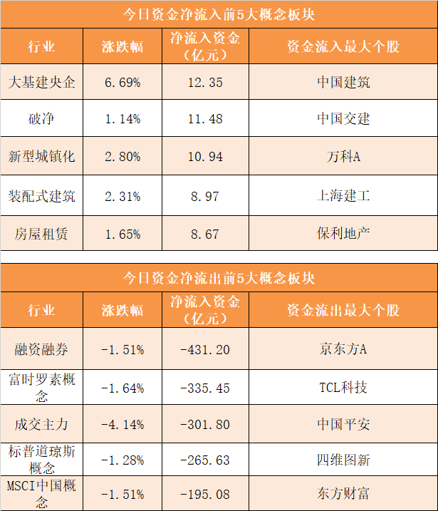 概念板块方面,今日大基建央企、破净、新型城镇化、装配式建筑等概念板块资金呈现净流入,其中大基建央企概念净流入12.35亿元居首。