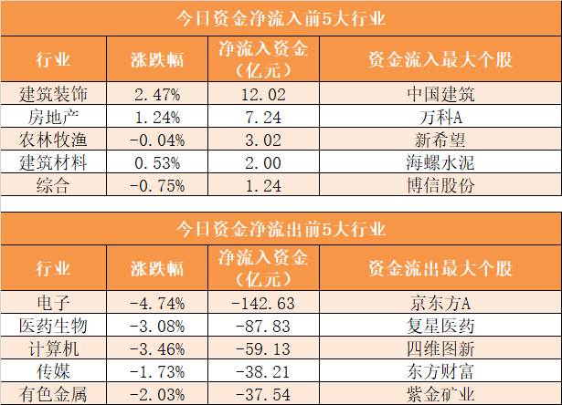 28个申万一级行业中,6个行业实现资金净流入,其中建筑装饰行业净流入12.02亿元居首。