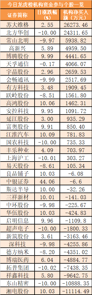 盘后龙虎榜数据显示,机构现身35股,其中苏大维格等19股呈现机构资金净买入,湘电股份等16股呈现机构资金净卖出。