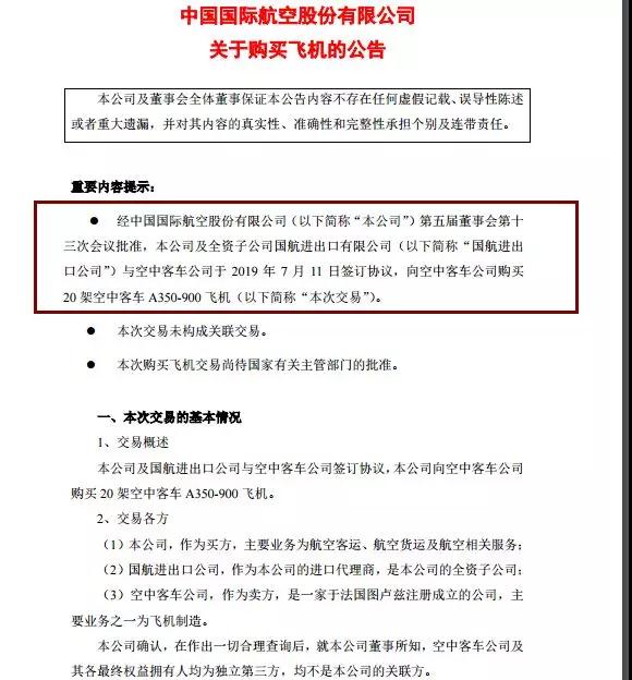 今日晚间,中国国航发布《关于购买飞机的公告》称,公司及国航进出口公司与空中客车公司签订协议,本公司向空中客车公司购买20架空中客车A350-900飞机。
