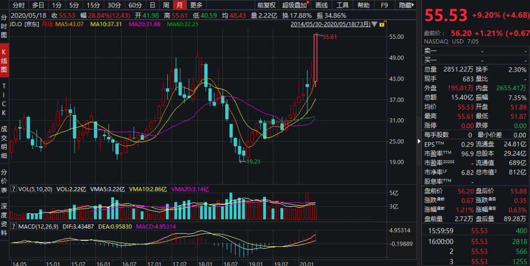 美国当地时间5月18日,京东美股大涨9.2%、收于55.53美元/股,创下其股价历史新高。