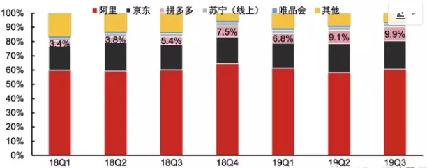 安信国际研报显示,2019Q3,除拼多多(111%)继续保持三位数高增长外,天猫(26%,仅实物)、京东(26.6%,仅自营)增速同样领先行业。第二梯队中,苏宁(19.5%)、唯品会(17%)增速基本与电商行业增速持平(整体电商14.9%/实物电商18.4%)。Top3电商平台强者恒强,测算阿里(含天猫&淘宝)、京东、拼多多三家合计市场份额约90.4%,市场集中度持续提升。