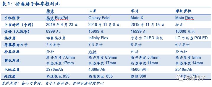 据安信证券研究,折叠屏手机相比于传统的旗舰机,需要柔性、耐弯折的OLED显示屏以及承担连接手机两个屏幕的精密铰链,其增加的原材料成本主要体现在显示屏、铰链等零部件上。