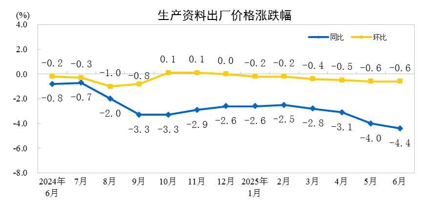 7月9日,国家统计局发布最新数据显示,2025年6月份,全国工业生产者出厂价格同比下降3.6%,环比下降0.4%;工业生产者购进价格同比下降4.3%,环比下降0.7%。上半年,工业生产者出厂价格比上年同期下降2.8%,工业生产者购进价格下降2.9%。